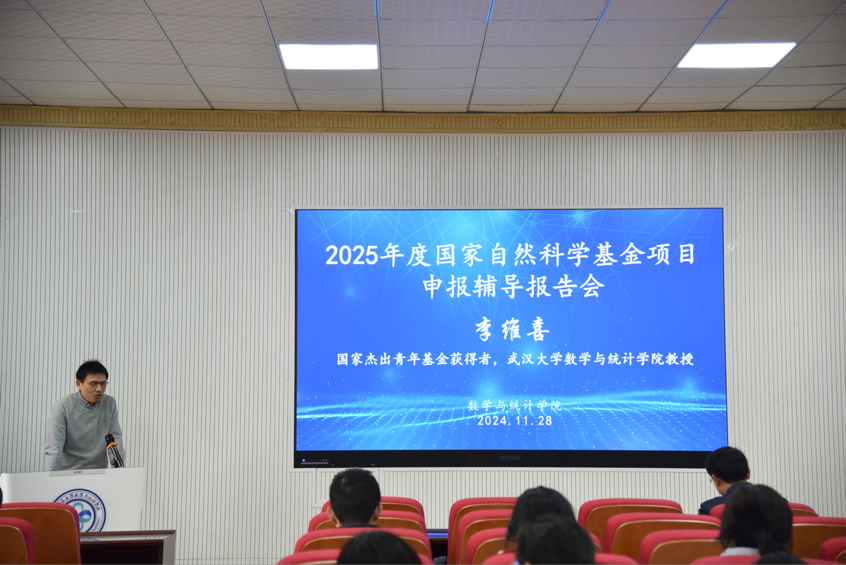 11月28日下午,学院于长清湖校区文渊楼B119报告厅举办2025年国家自然科学基金申报辅导会,会议邀请国家杰出青年基金获得者、武汉大学数学与统计学院李维喜教授作报告。学院全体青年教师和博士研究生参加了会议,会议由执行院长赵强主持。