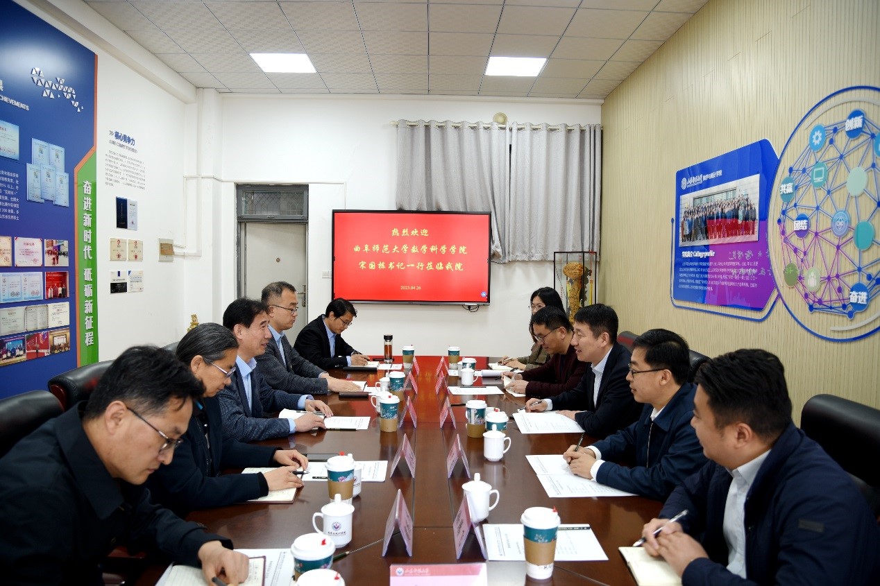 战秉聚首先代表数学与统计学院对曲阜师范大学数学科学学院一行表示欢迎,希望通过本次交流架起互通有无的桥梁,为两院之间深层次合作奠定良好的基础。院长李晓迪介绍了学院的办学历史、办学特色以及近期在人才培养、科学研究、学科建设、师资队伍等方面取得的成就。宋国栋对曲阜师范大学数学科学学院的建设情况做了简要介绍,对我院近年来的办学成就十分赞赏。双方重点围绕党建业务融合、党建品牌打造、支部建设等工作展开深入交流。