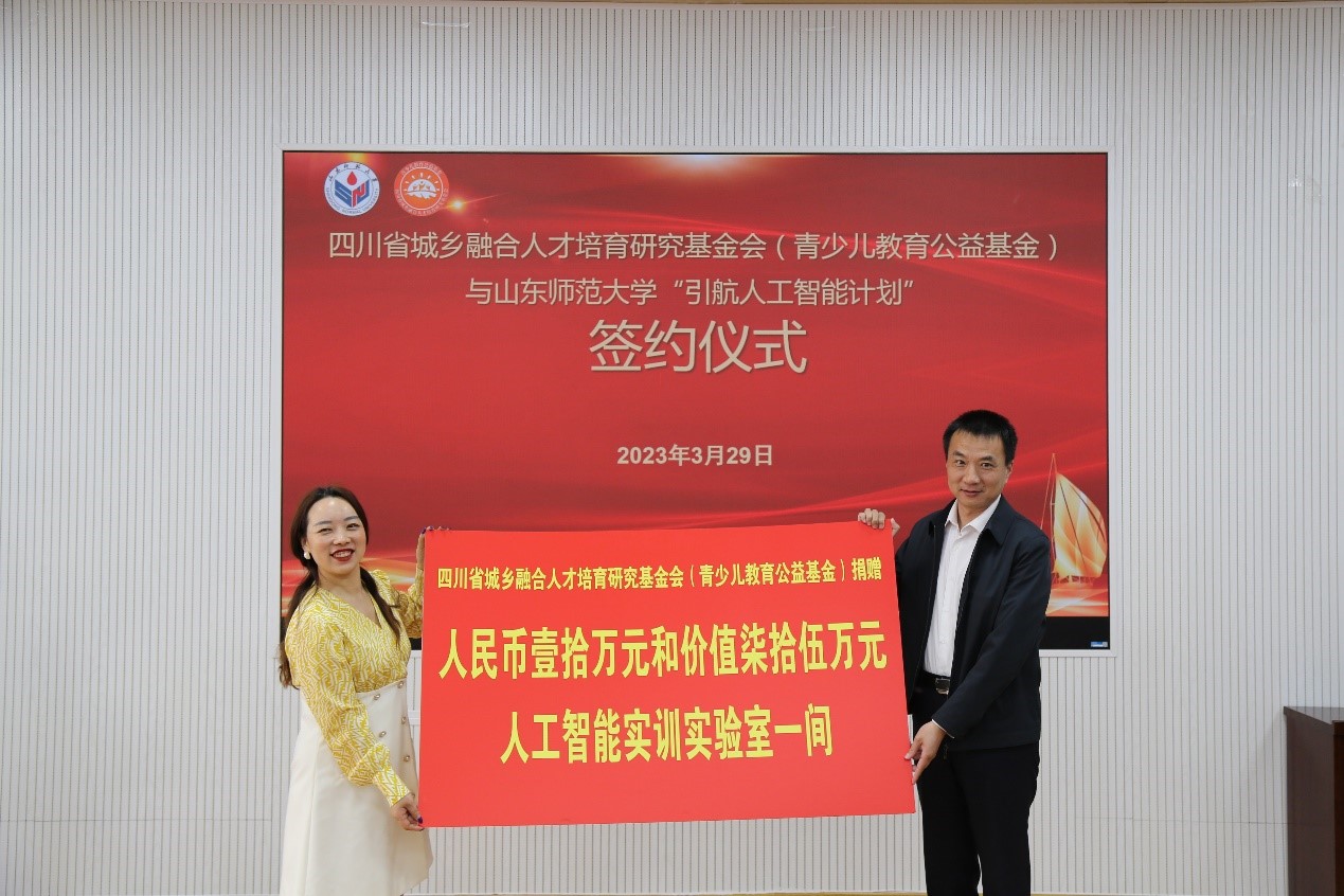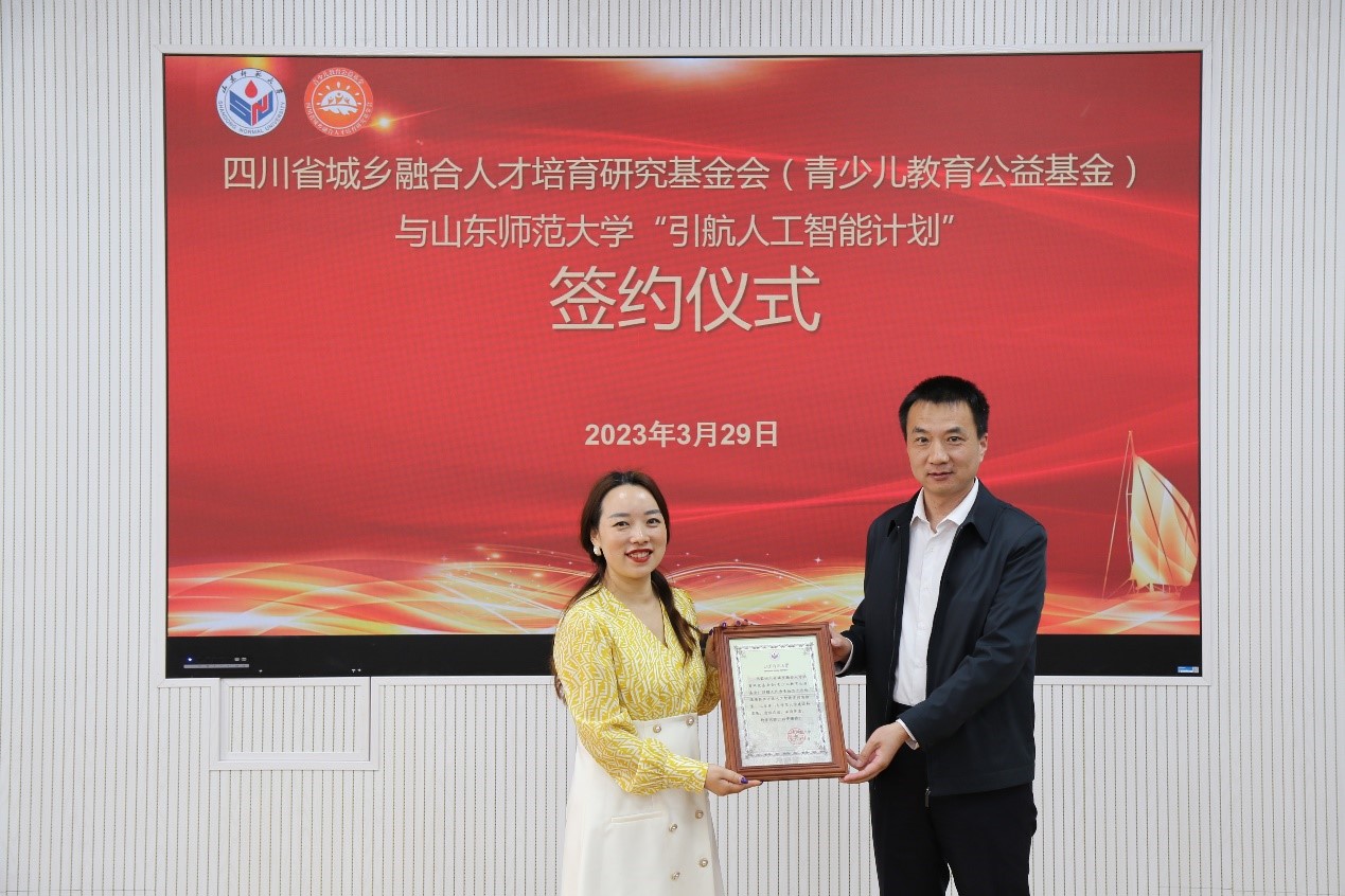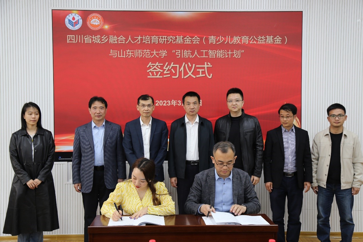 3月29日下午,山东师范大学与四川省城乡融合人才培育研究基金会(青少儿教育公益基金)、成都市诚学长青公益服务中心“引航人工智能计划”签约仪式在长清湖校区举行。学校党委常委、副校长许双庆,四川省城乡融合人才培育研究基金会青少儿教育公益基金副部长王悦语,山东大学数据科学研究院副院长郭亮,诚学长青公益服务中心公益代表赵川出席仪式。签约仪式由学院党委书记战秉聚主持。