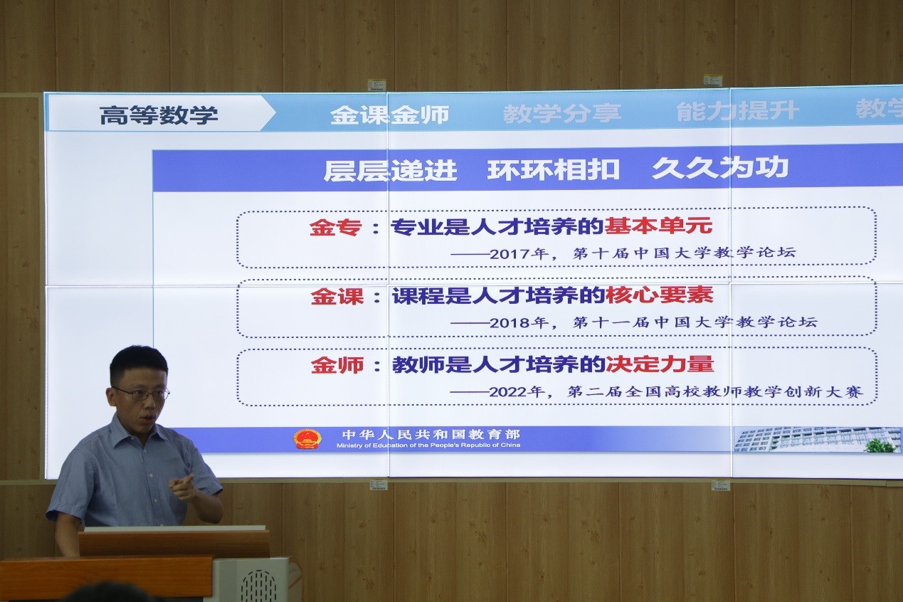 山东省青年教学能手比赛一等奖获得者周峰老师从自身经验出发,结合高等数学与概率统计的例子,向大家分享了教师教学的基本能力以及知识转化能力,并且针对教学比赛,总结了“一个中心,五个基本点”的备赛重点,以“正难则反,化繁为简”为原则,强调了课程创新、课程完整性以及时间把控的重要性。