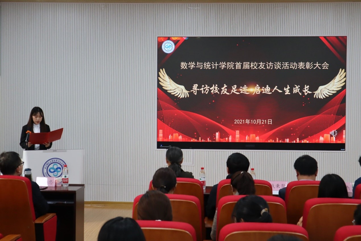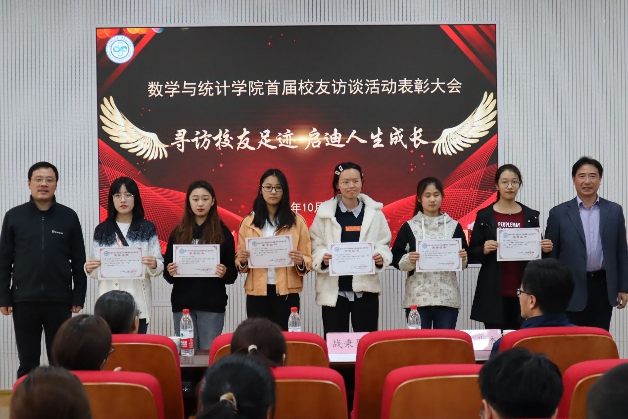 会上,葛海滨汇报2021年度暑期校友访谈活动概况并宣读《关于表彰2021年度“寻访校友足迹 启迪人生成长”数学与统计学院首届校友访谈活动优秀作品的决定》。其间,他总结道,本次暑期校友访谈活动,学院共派出53支队伍走访省内各地市,累计采访校友141人,取得丰硕成果。在颁奖环节,校友办领导、院领导班子为优秀访谈队伍颁发获奖证书并合影留念。