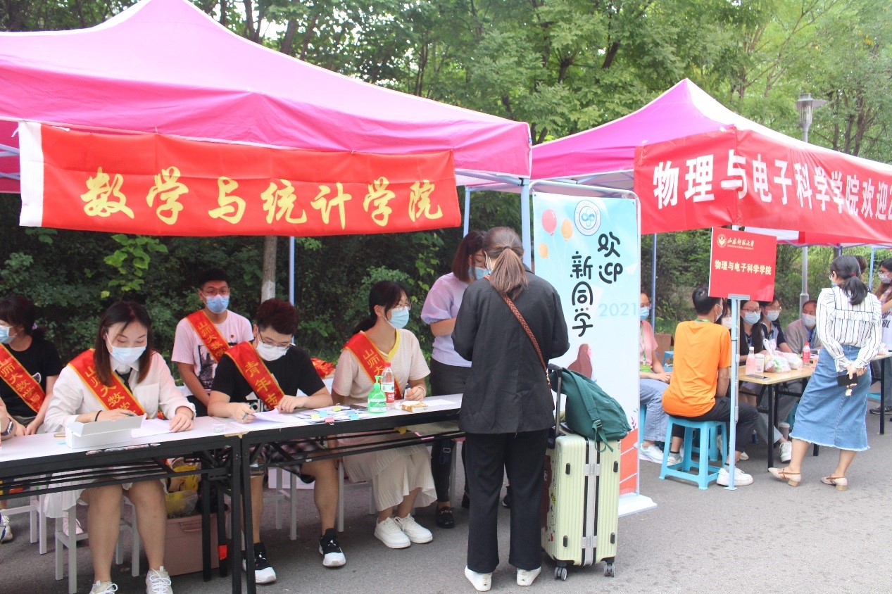 明心湖畔,梅谷堂前。山东师范大学数学与统计学院迎来了2021级新生,初秋的文渊楼B区焕发着别样的青春光彩。