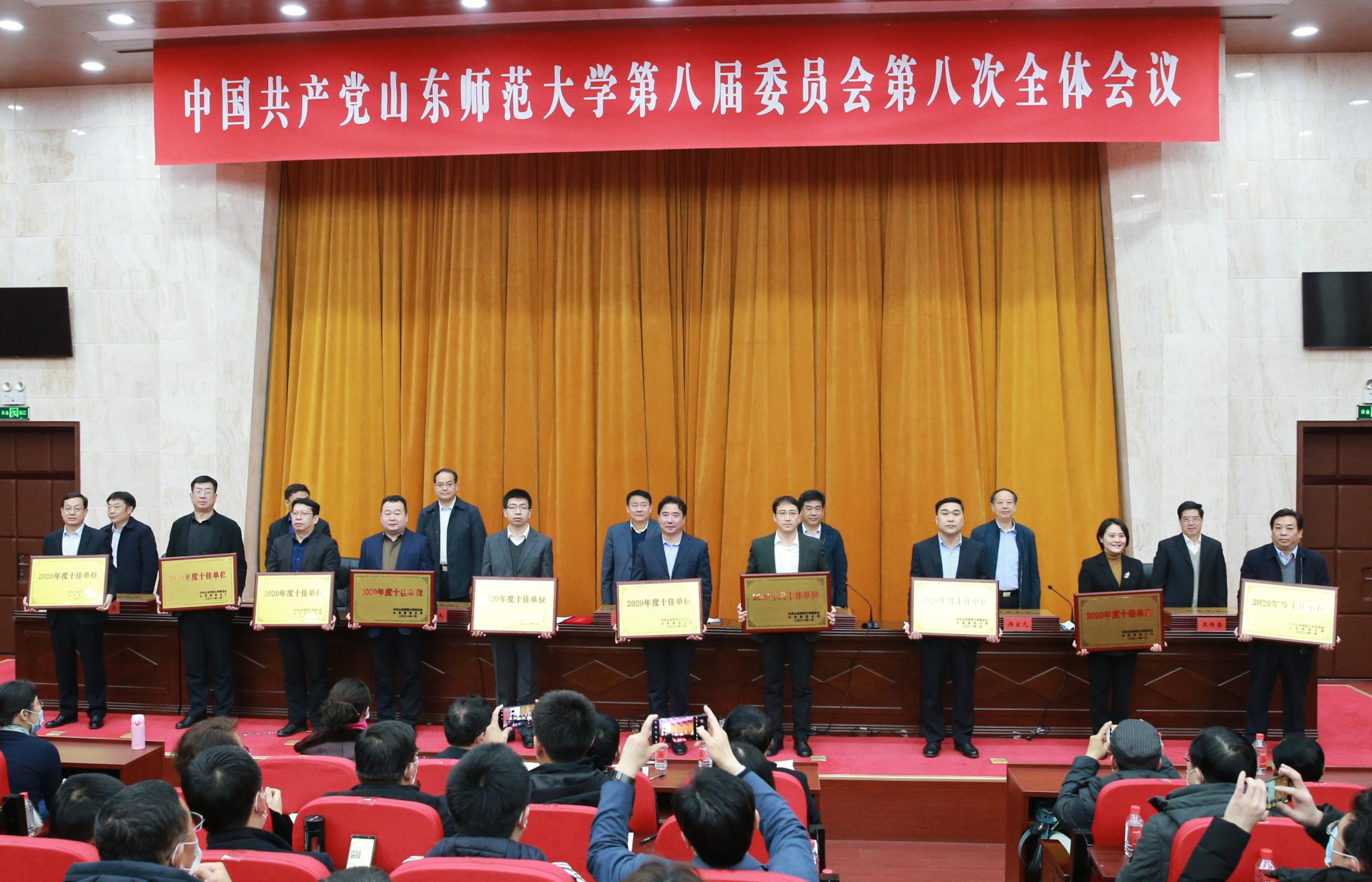 学院荣获“2020年度十佳单位”称号,校党委书记唐洲雁为学院颁授奖牌,院党委书记战秉聚代表学院上台领奖。