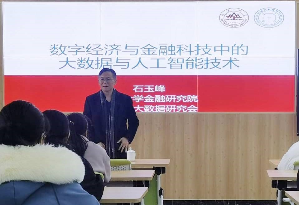 12月30日下午,我校优秀校友——山东省大数据研究会会长、山东大学金融研究院副院长石玉峰教授应数学与统计学院邀请,在长清湖校区文渊楼B区434报告厅作了题为《数字经济与金融科技中的大数据与人工智能》的学术报告。学院部分教师、研究生和本科生聆听了此次讲座。