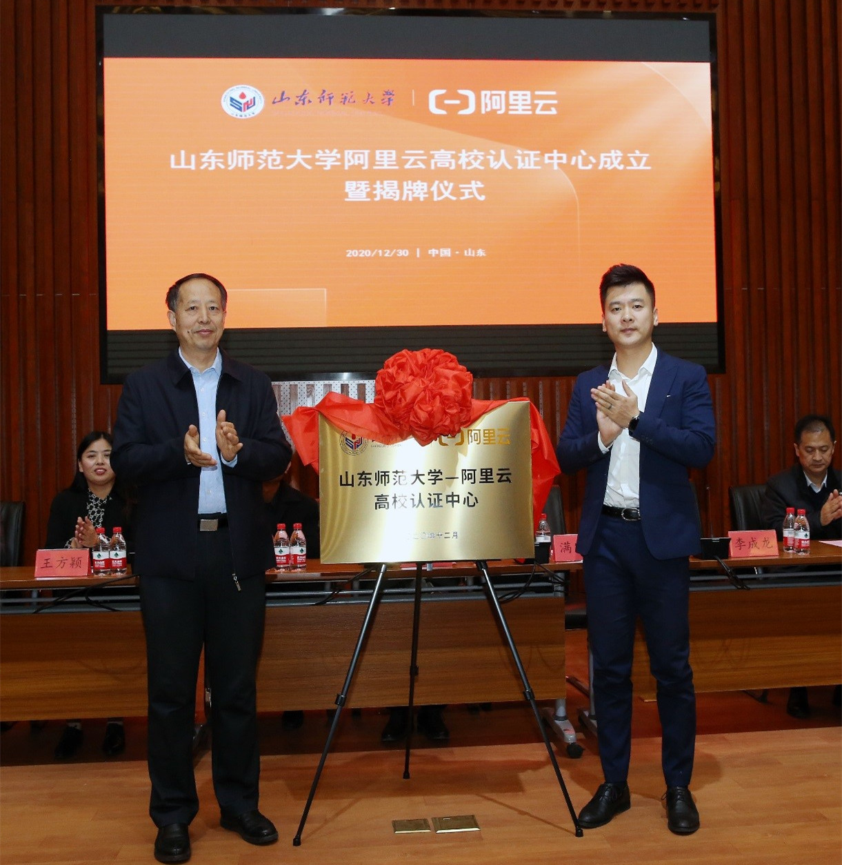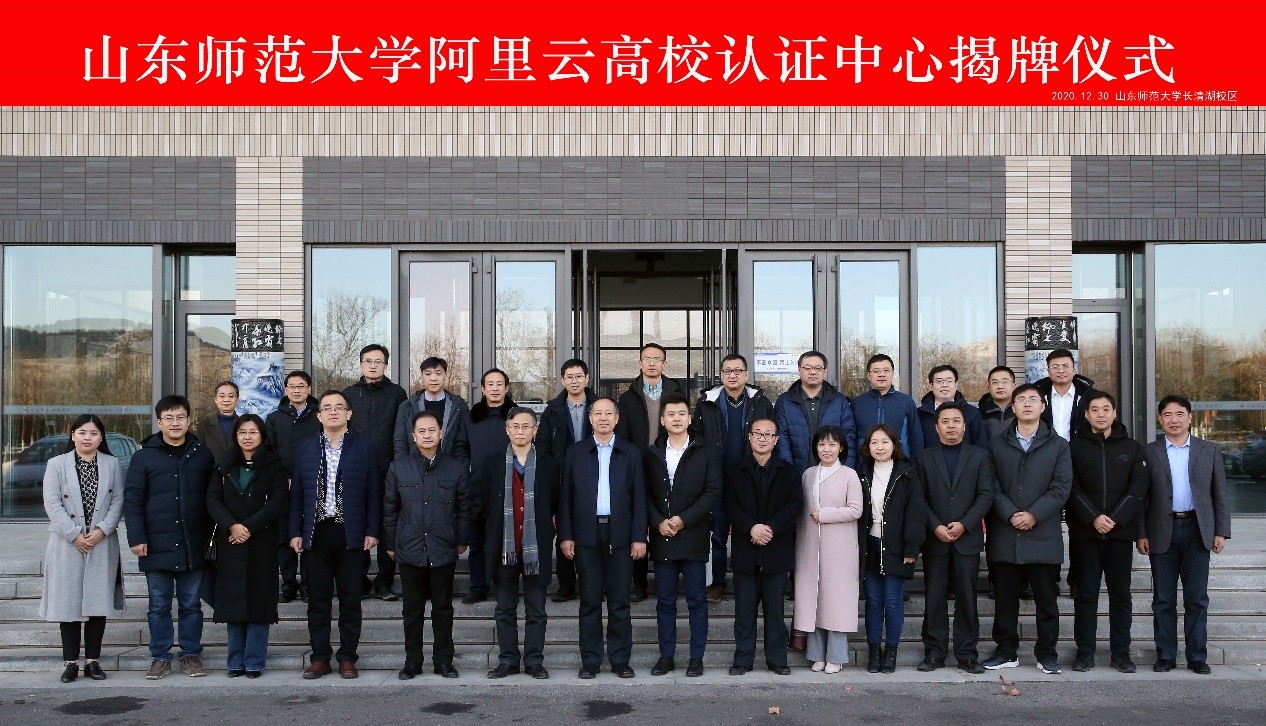 12月30日,山东师范大学-阿里云高校认证中心成立暨揭牌仪式于长清湖校区文昌楼108会议室隆重举行。山东师范大学副校长满宝元,阿里云计算有限公司北方大区冀鲁总经理李成龙、山东省大数据研究会会长石玉峰、北京中科赋华教育科技有限公司董事长王方颖、阿里云大学高校合作总监吴兴华出席大会,山东省大数据局、济南市大数据局、长清区工信局等有关单位的领导和齐鲁工业大学、山东中医药大学等兄弟院校的代表、学校有关部门负责人出席会议。大会由数学与统计学院党委书记战秉聚主持。