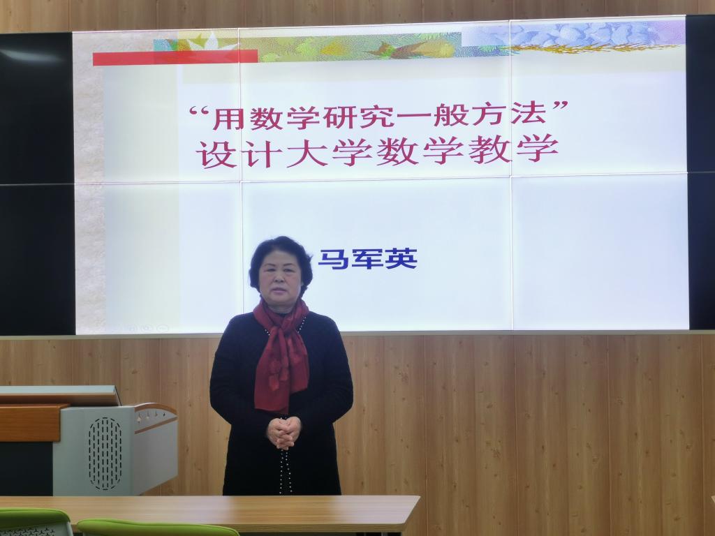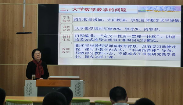本次报告会中,马军英从传统教育教学方法出发,以大学数学课堂为基础,提出对教育教学的认识及建议。马军英以优秀教师管梅谷为例讲述优良教学教风,并从大学数学教什么、大学数学教学中的问题、大学数学教学怎么教三个方面展开详细报告。报告从“大学数学教什么”展开,强调思维方式对数学学习的重要性,教师要注重引导学生思维,以提高对数学体系的整体把握。对于“大学教学中的问题”,她指出在学生情况、课程设置、教材体系、教师教学四个方面存在的问题。对“大学数学怎么教”问题,她介绍了一般的教学方法:用教学研究的一般方法设计教学,创设情境、提出问题,用“问题结构”推进教学进程,总结巩固、深化拓展,并对教学中应该注意的教学本质、教学语言、教学手段等方面问题做出强调。