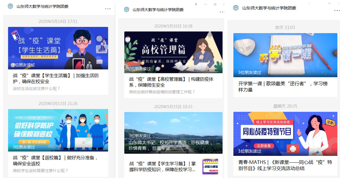 学院微信公众平台连续六天推送了同学们观看防疫系列节目纪实。同学们纷纷留言表示受益匪浅。有的同学说“观看节目后我进一步树立了安全防范意识、学习了各项防疫知识、了解了高校管理条例,为返校生活做好了充分准备。”有的同学说:“青山一道同云雨,明月何曾是两乡。”在观看了《开学第一课》这堂别开生面的思政课之后,同学们感触颇多,思想得到了净化和升华,“疫情是一本教科书,让我们在感受逆行者无私奉献的同时,提升自身的素养,明白生命的意义,更让我们懂得了家国情怀和责任担当。在节目中,那一个个时代楷模的模样,是我们每个人心中英雄梦的缩影。在疫情期间,我们将共同努力,使返校顺利安全进行。”还有的同学已经开始着手准备口罩、体温计等必备个人防疫用品,将疫情防控的准备落在了实处。