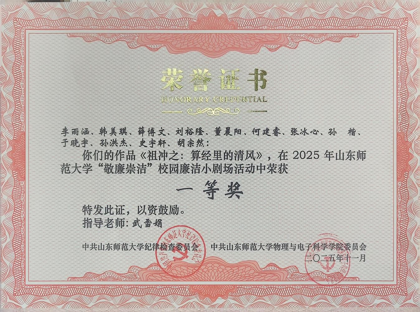 一场话剧,不仅是一次精彩的舞台演绎,更是一堂生动的廉洁教育课。《祖冲之:算经里的清风》以数学先贤为榜样,用艺术的力量传递廉洁正能量,既展现了数院学子的青春风采,更彰显了学院深耕文化育人的坚定初心。此次获奖,是对学院文化育人成果的充分肯定,更是学院将数学专业特色与廉洁教育、思政教育深度融合的生动实践。