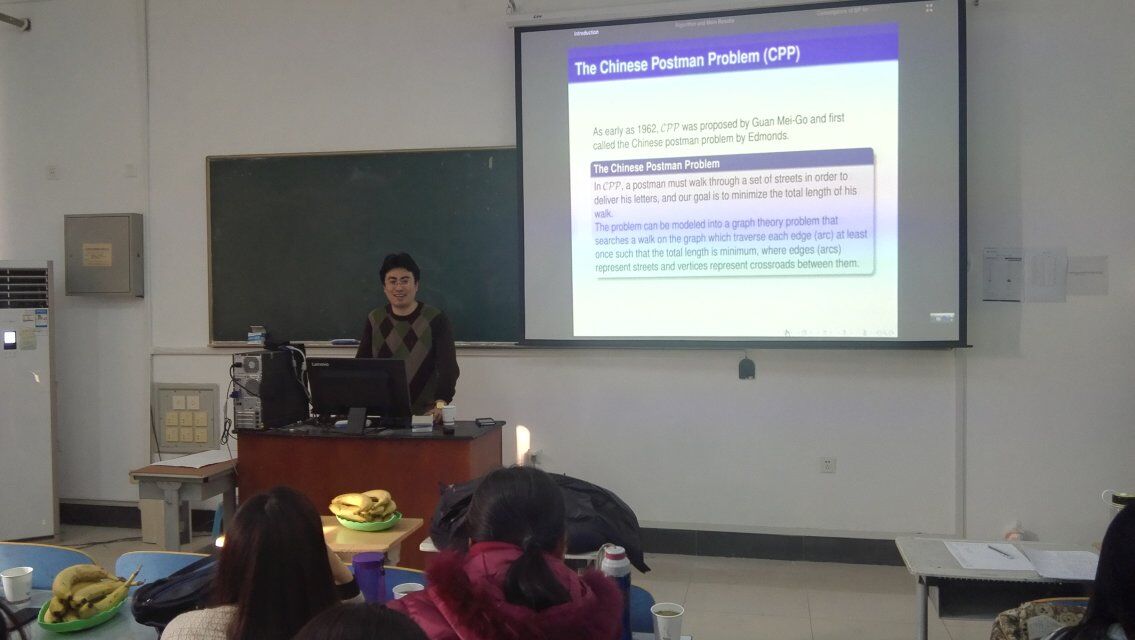 为了让同学们对于中国邮递员问题有进一步的了解,12月16日上午在综合实验楼F区532教室由来自南京师范大学的教授、博士生导师张晓岩教授做了题为Belief Propagation and Chinese Postman Problems---Applying Machine Learning in Combinatorial Optimization的报告会,本次报告会孙磊老师、李敏老师、岳军老师以及一些研究生、本科生参加。