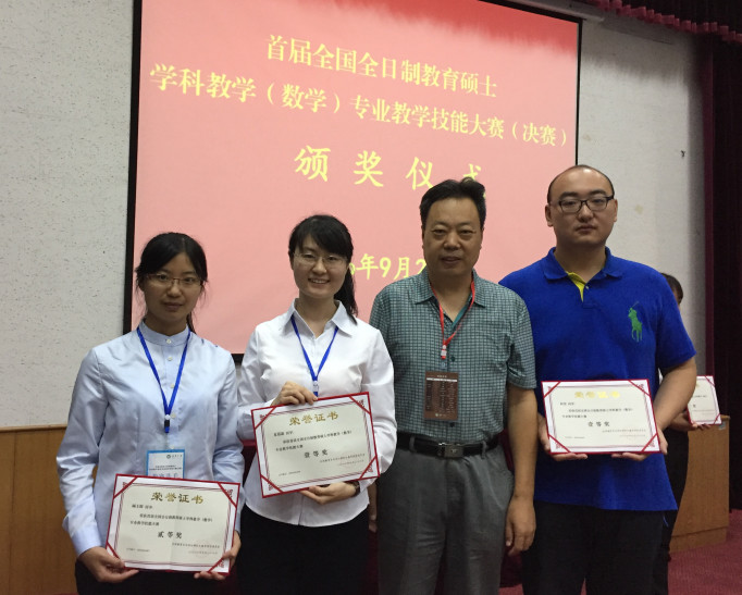 2016年9月24-26日,由全国教育专业学位研究生教育指导委员会与全国数学教育研究会共同主办,鲁东大学研究生院承办的第一届全日制教育硕士学科教学(数学)专业教学技能大赛决赛在烟台圆满结束。来自全国69所培养院校的128名教育硕士参加了本次大赛的决赛。经过激烈角逐,代表山东师范大学数学与统计学院参赛的3名选手在本次比赛中表现出色,权奎、夏蓓菡获一等奖,阚王琛同学获二等奖,获奖层次和获奖人数位居全国培养高校前列。傅海伦、杨泽忠两位教授被评为“优秀指导教师”。