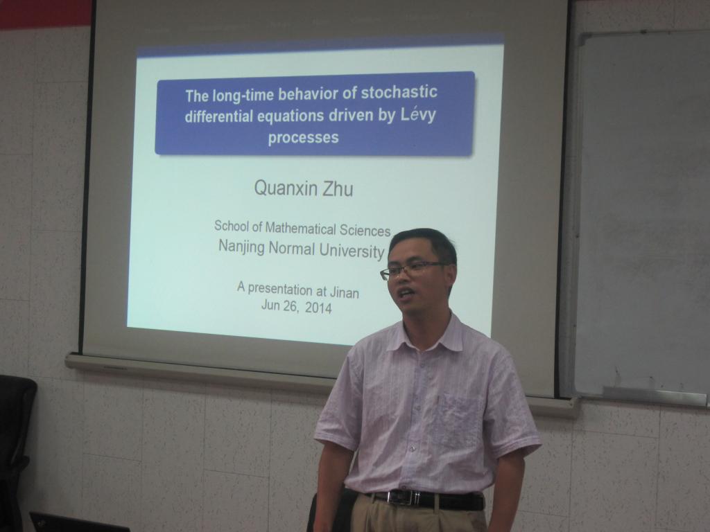 6月26日下午,应数学科学学院邀请,南京师范大学数科院博士生导师朱全新教授来我校,在数科院会议室作了题为《The long-time behavior of stochastic differential equations driven by Levy processes》的学术报告。数科院院长陈焕贞、党委书记刘庆刚、金融统计系主任高敬振、数学系主任李晓迪等30余名师生聆听了报告。报告由陈焕贞院长主持。