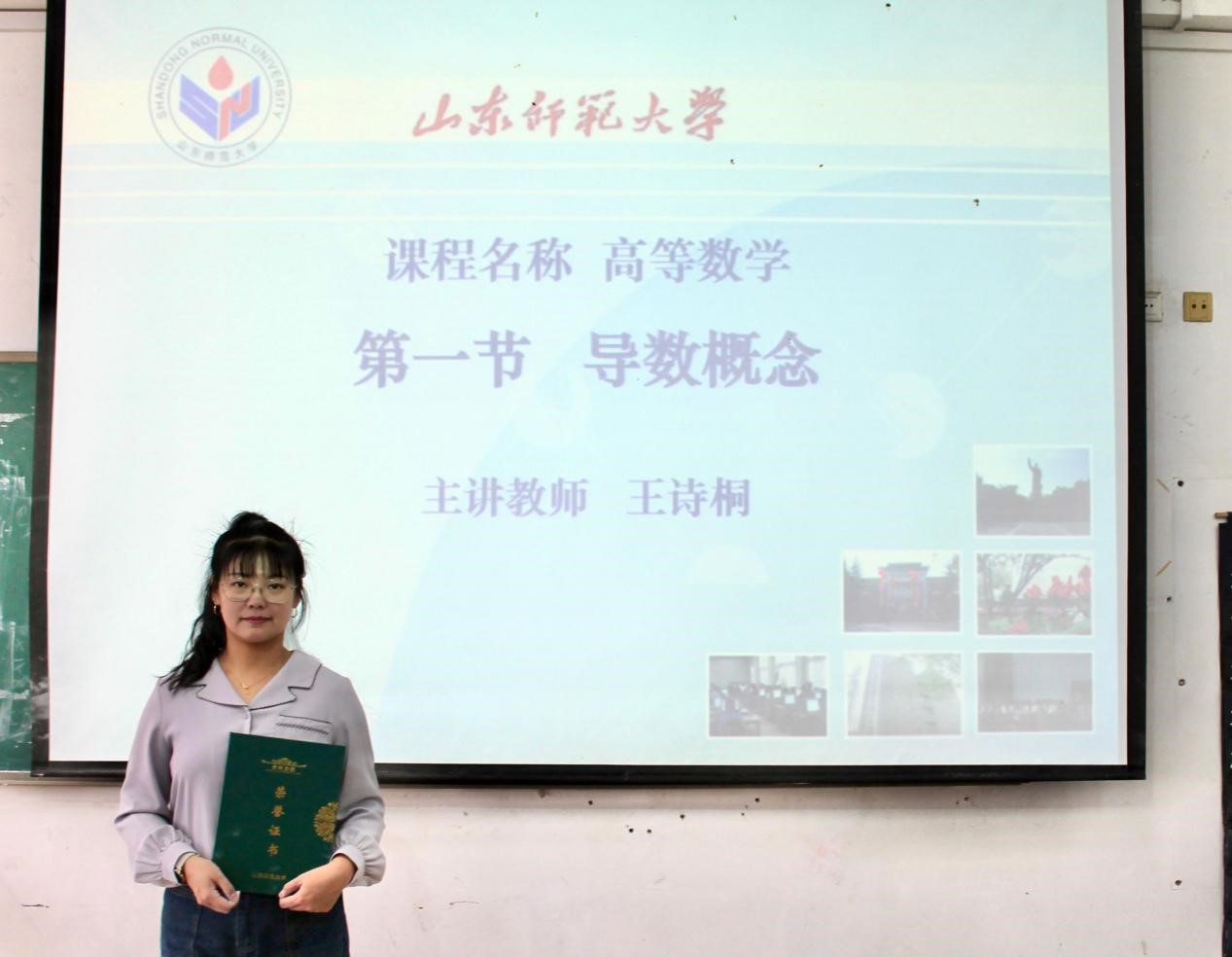 在课堂展示环节,王诗桐以《高等数学》第二章“导数的概念”为题,用切线问题和质点直线运动引入导数的概念,讲授了导数的定义,并利用例题与几何意义,结合图像,深化学生对定义的理解,在此基础上,引导学生求初等函数的导数。在提问环节中,师生互动,有效调动了学生学习和思考的积极性。在整个课堂教学过程,王诗桐授课思路严密清晰,充分利用板书展示例题的解题过程,深入浅出地剖析了导数的概念,并结合图像,将抽象的概念转化为学生易于理解的知识。整个授课过程展现了她扎实的教学基本功,营造了活跃的课堂氛围,受到师生的一致好评。