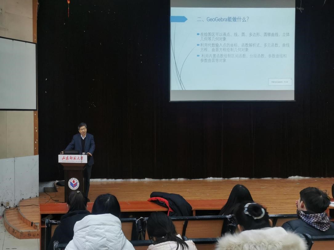 杨杰老师首先向同学们介绍了教学软件在数学教学过程中的重要性,强调直观的图形演示能够帮助学生更好的学习掌握知识。杨老师以数学软件GeoGebra为例,对其功能和使用方法进行介绍,GeoGebra可以使数学的推理演绎过程可视化,让学生们可以“看到”抽象的概念并将教学中的表征有机地关联起来,其动态数学功能还可以帮助学生进一步探索与尝试,激发学生学习兴趣,帮助学生理解与记忆。随后,杨老师以海滩机械怪兽和谢尔宾斯基地毯为例向同学们展示GeoGebra的基本操作。最后,杨老师对同学们提出要求,希望同学们能掌握基本数学软件的使用方法,提高教学技能,有效应用教学软件,将科技与教学相结合成为有理想信念、有道德情操、有扎实学识、有仁爱之心的优秀青年教师。