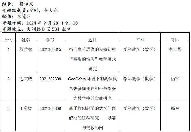 2024.9.21数学与统计学院2023级课程与教学论(数学)专业硕士研究生开题公告