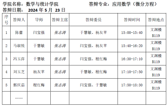 2024.05.23 数学与统计学院2024届应用数学专业(微分方程方向)硕士研究生答辩公告