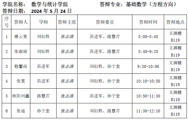 2024.05.24数学与统计学院2024届基础数学专业(方程方向)硕士研究生答辩公告
