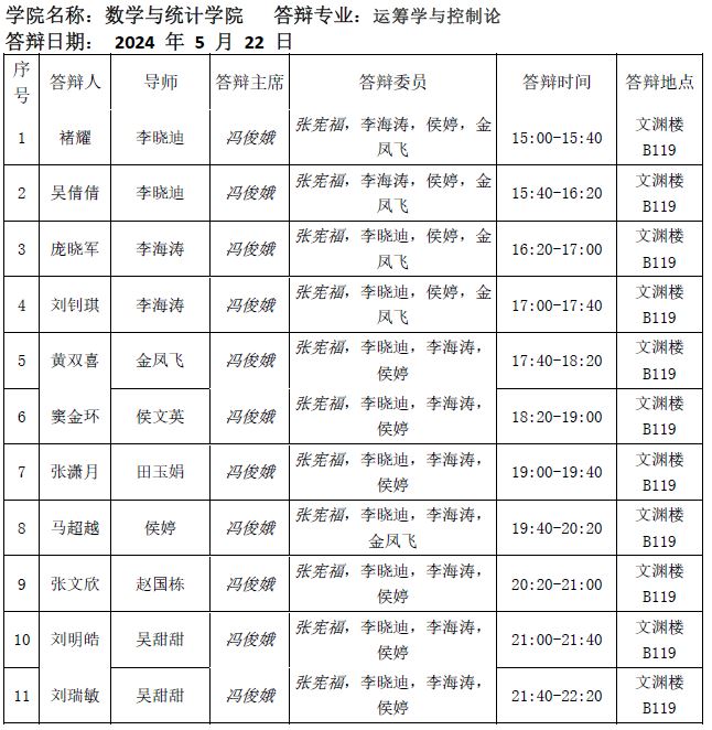 2024.5.22数学与统计学院2024届运筹学与控制论专业硕士研究生答辩公告