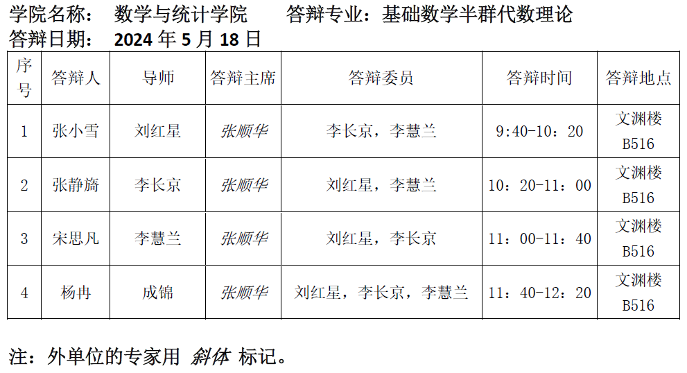 2024.5.18 数学与统计学院2024届基础数学专业学术硕士研究生答辩公告