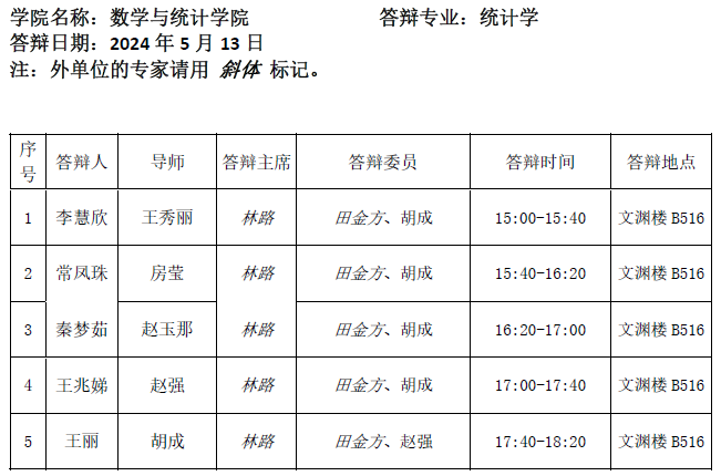 2024.5.13数学与统计学院2024届统计学硕士研究生答辩公告