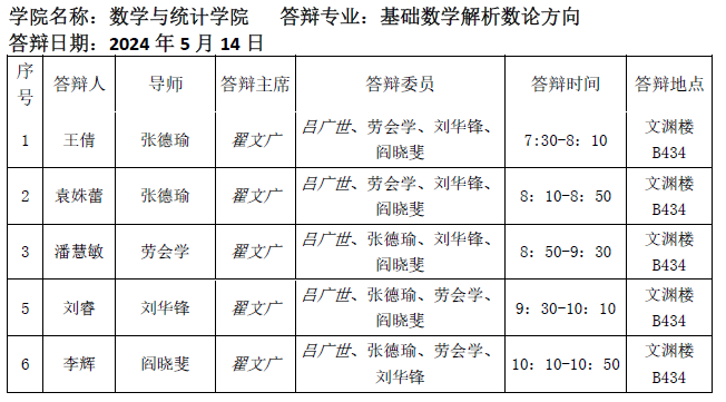 2024.05.14数学与统计学院2024届基础数学(解析数论方向)博士研究生答辩公告