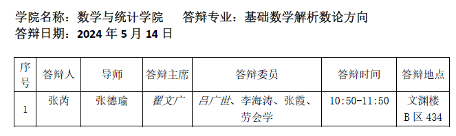 2024.05.14数学与统计学院2024届基础数学(解析数论方向)博士研究生答辩公告