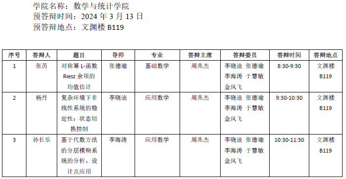 2024.3.13数学与统计学院2023届博士研究生预答辩公告