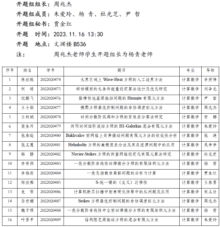 2023.11.16数学与统计学院2022级 计算数学专业研究生开题公告
