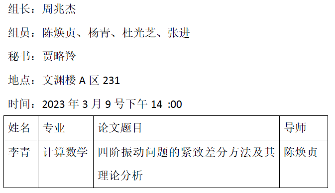 2023.3.9数学与统计学院2019级计算数学专业博士研究生预答辩公告