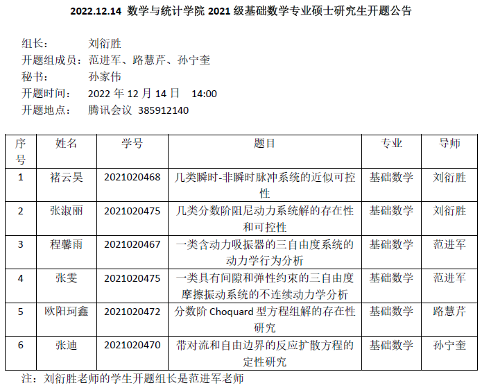 2022.12.14 数学与统计学院2021级基础数学专业硕士研究生开题公告