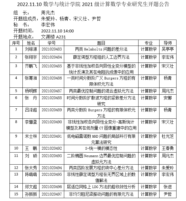 2022.11.10数学与统计学院2021级计算数学专业研究生开题公告