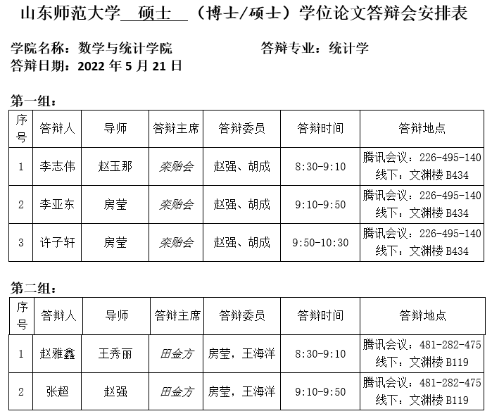 2022.5.21数学与统计学院2022届统计学硕士研究生答辩公告