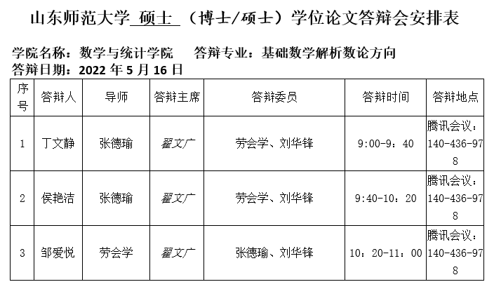 2022.5.16数学与统计学院2022届基础数学(解析数论方向)硕士研究生答辩公告