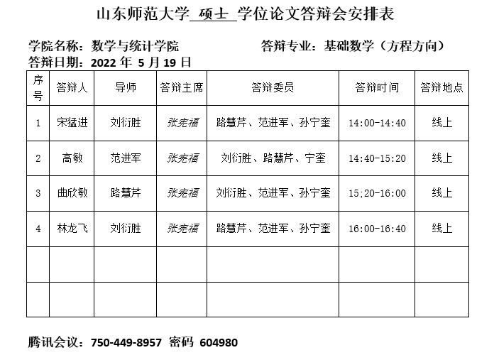 2022.5.19数学与统计学院2022届基础数学(方程方向)硕士研究生答辩公告