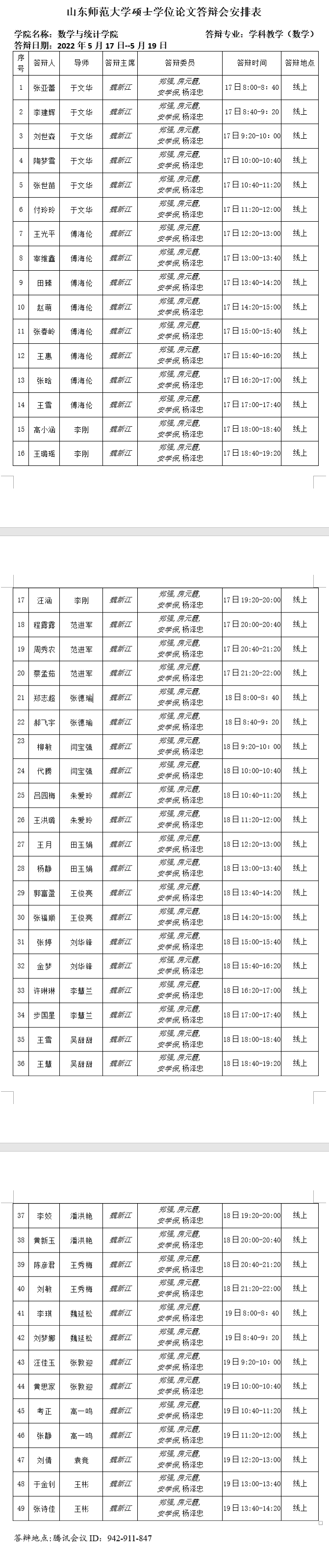 2022.5.15数学与统计学院2022届课程与教学论(数学)专业硕士研究生答辩公告