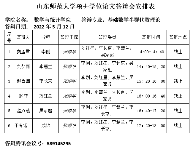 2022.05.12数学与统计学院2022届基础数学专业学术硕士研究生答辩公告