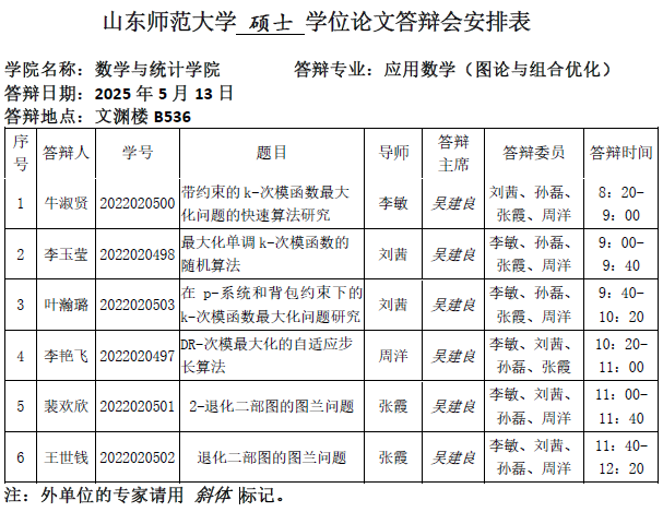 2025.05.13数学与统计学院2025届应用数学专业(图论与组合优化方向)硕士研究生答辩公告