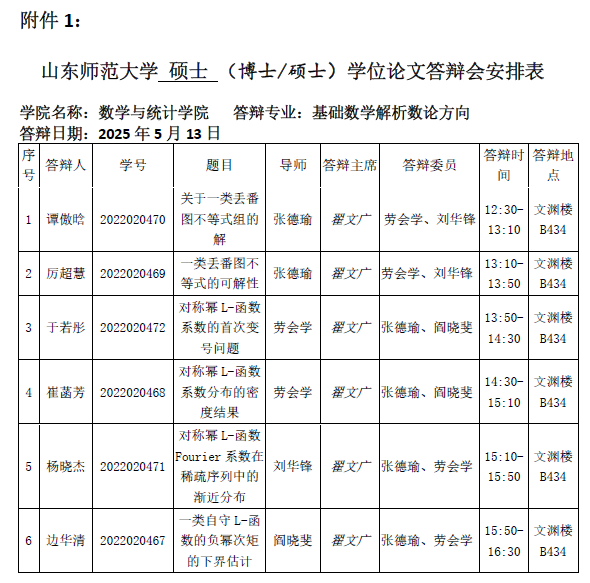 2025.5.13数学与统计学院2025届基础数学(解析数论方向)博士研究生答辩公告