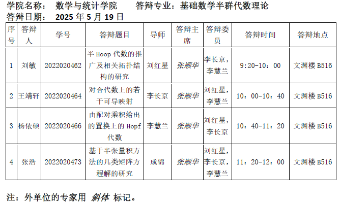 2025.5.19 数学与统计学院2025届基础数学专业学术硕士研究生答辩公告