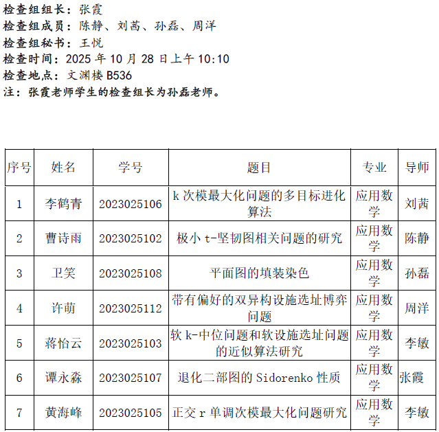 2025.10.28数学与统计学院2023级应用数学专业(图论组合优化方向)研究生学位论文中期检查公告
