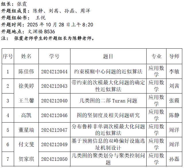 2025.10.28数学与统计学院2024级应用数学专业(图论组合优化方向)研究生学位论文开题公告
