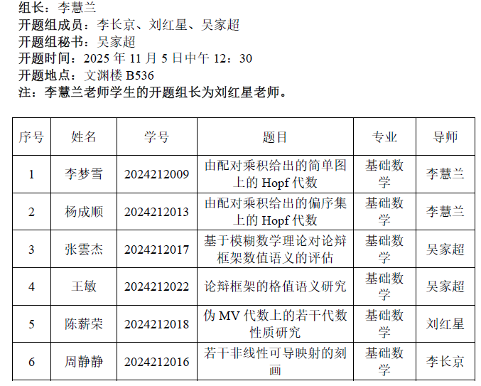 2025.11.05数学与统计学院2024级基础数学专业(半群代数理论方向)研究生学位论文开题公告