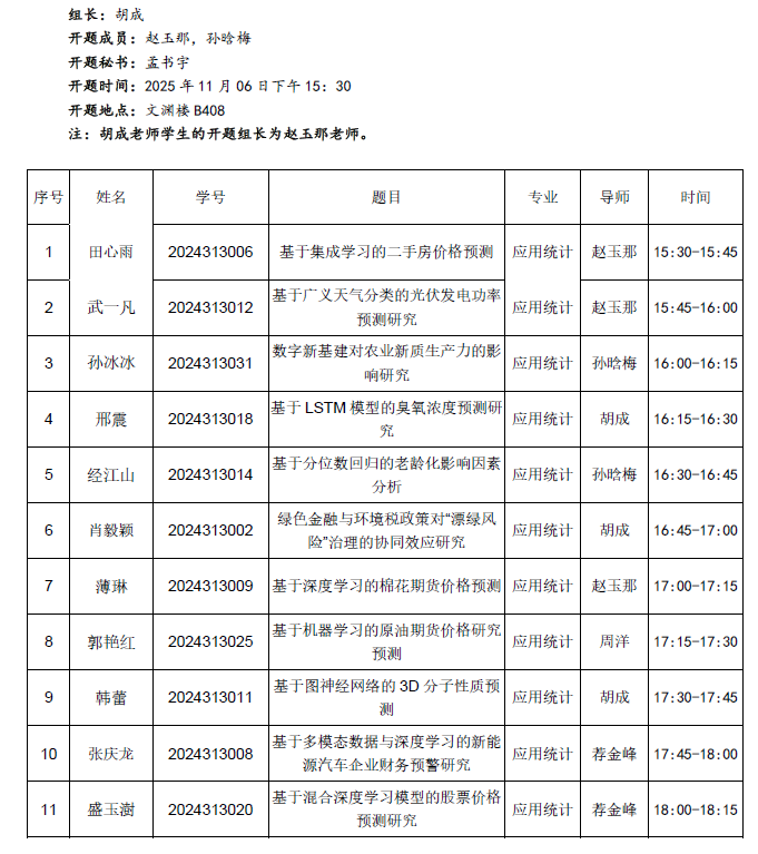 2025.11.06数学与统计学院2024级应用统计专业研究生学位论文开题公告(第二组)