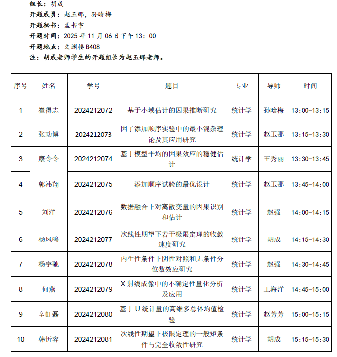 2025.11.06数学与统计学院2024级统计学专业研究生学位论文开题公告