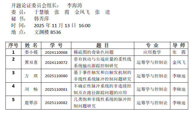 2025.11.10数学与统计学院2024级应用数学专业(微分方程方向)研究生学位论文开题公告