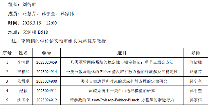 2026.3.20数学与统计学院2023级运筹学与控制论专业 研究生预答辩公告