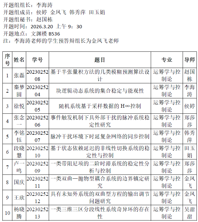2026.3.20数学与统计学院2023级运筹学与控制论专业 研究生预答辩公告