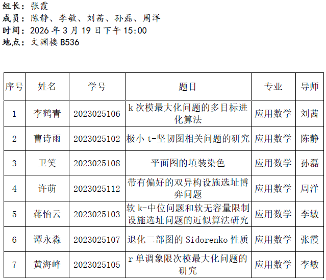 2026.3.19数学与统计学院2023级应用数学专业(图论组合优化方向)研究生学位论文预审公告