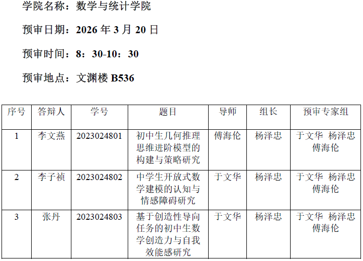 2026.03.20 数学与统计学院2026届课程与教学论(数学)硕士研究生毕业论文预审公告