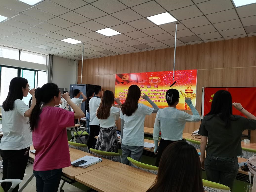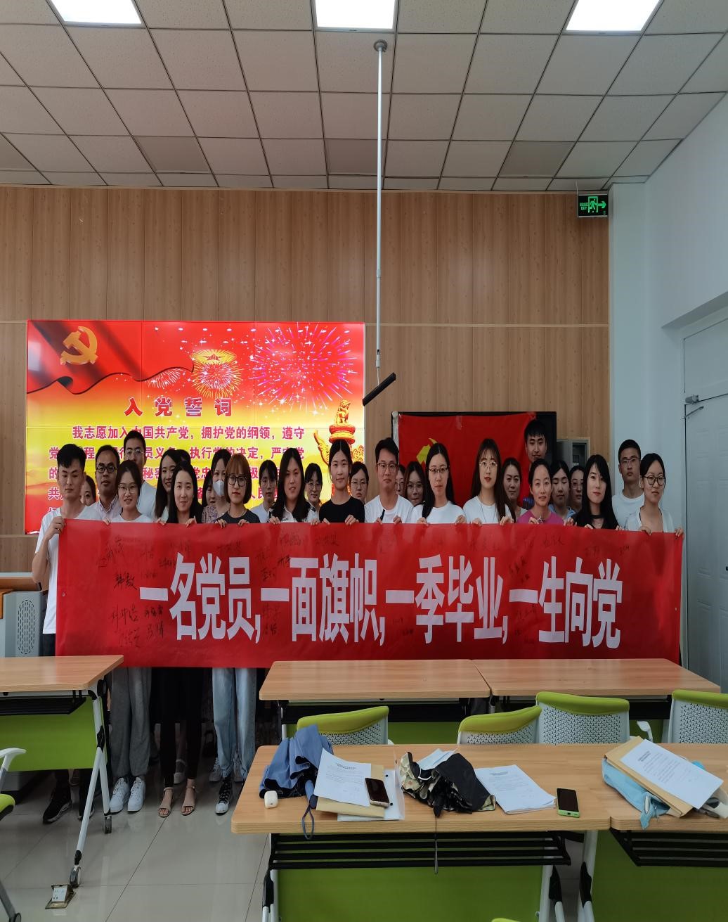 党员签名宣誓,牢记党员身份。吴相江带领所有毕业研究生党员庄严地重温了入党誓词,并在印有“一名党员,一面旗帜,一季毕业,一生向党”的横幅上签下自己的名字,通过铮铮的誓言、庄严的承诺,表达了坚定理想信念,对党矢志不渝的决心。