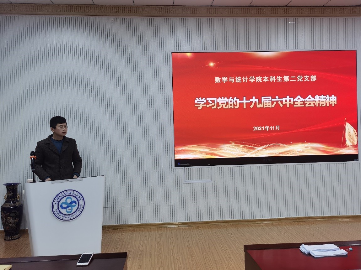 为深入学习贯彻党的十九届六中全会精神,数学与统计学院本科生第二党支部开展专题学习系列活动。11月25日,党支部在文渊楼B区119报告厅集中学习党的十九届六中全会精神,开展学习交流座谈,畅谈学习《中共中央关于党的百年奋斗重大成就和历史经验的决议》心得。
